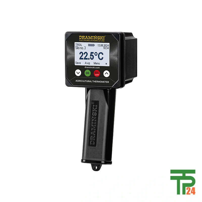 The Dramiński Agricultural Thermometer TROL2 is the second-generation professional solution designed for accurate temperature measurement in agricultural environments. With its robust stainless-steel probe and precise digital reader, it is perfectly suited for monitoring the temperature of hay, grain, silage, root vegetables, and other stored crops. The folding 1.5 m probe allows easy penetration into stacks, silos, and storage piles, providing fast, reliable readings. Each probe connects via a secure screw-in metal connector, ensuring constant measurement stability without accidental disconnection. This high-grade temperature meter is the answer to the demands of modern farms where precision, durability, and data management are paramount. Its versatility allows permanent probe installation in stored materials, making periodic checks more efficient by removing the need to recalibrate or wait for temperature adaptation.