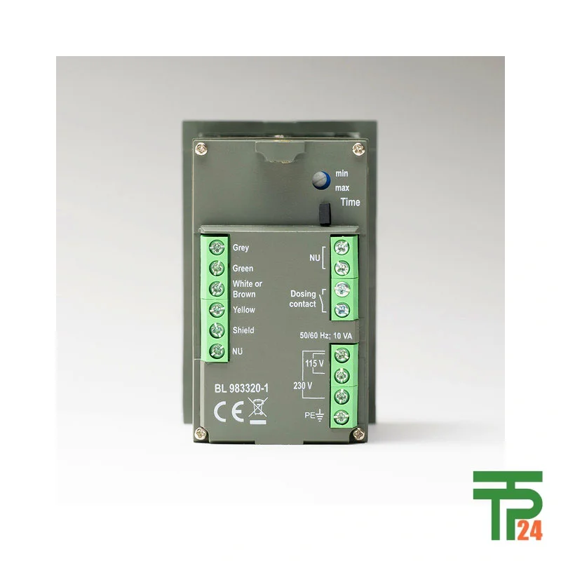 From an engineering perspective, the BL983320 aligns with industry demands for accuracy, safety, and longevity. With ±2% full-scale accuracy at 25°C, it meets strict control requirements in water quality assurance programs. The incorporation of automatic temperature compensation, adjustable set points, and manual calibration via the CAL trimmer ensures performance stability over time. Electrical compliance is bolstered by fuse-protected dosing contacts rated for use with 250 Vac or 30 VDC systems, making it compatible with a broad range of industrial control architectures. The fire-retardant casing and splash-resistant front cover enhance its durability in environments with exposure risks, maintaining structural integrity and measurement reliability. The BL983320 also benefits from a clear differentiation between measurement and control functions, preventing conflicts between dosing commands and relay override operations. As such, it effectively integrates measurement precision, operational safety, and industrial compliance into a singular compact product offering unmatched in its category, especially when sourced through tpt24.com, where quality control processes ensure equipment meets factory-spec performance.